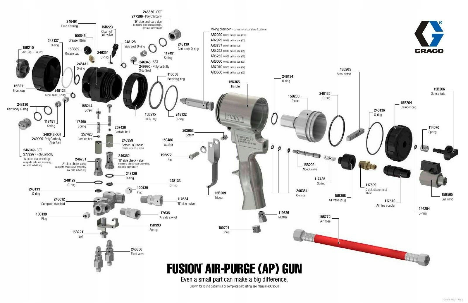 Kompletny zestaw pierścieni uszczelniających 246355 Graco Fusion AP zawiera wszystkie pierścienie uszczelniające wymagane do odbudowy i naprawy pistoletu Fusion AP. Obejmuje wszystko na rękojeści pistoletu, a także o-ringi zaworu zwrotnego, o-ringi uszczelnienia bocznego i wszystkie inne o-ringi na pistolecie.
